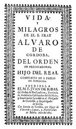 Portada del libro Vida, y milagros del Bienaventurado San Álvaro de Córdoba, del Orden de Predicadores, hijo del Real Convento de San Pablo de Córdoba.