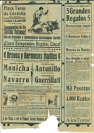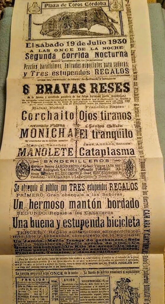 Cartel de la segunda corrida nocturna celebrada el sábado 19 de julio de 1930, en la antigua Plaza de Toros «Los Tejares», donde aparece «El Monicha» y otros novilleros noveles.