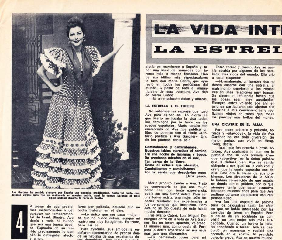 Su vida amorosa era entonces una montaña rusa. Apenas había superado los dramáticos episodios con su esposo, Frank Sinatra, con quien mantenía una relación tan tormentosa como apasionada. Tras Sinatra, apareció el torero Mario Cabré, un romance fugaz que dejó huella en la prensa y en la vida de Gardner. Sin embargo, fue otro torero, Luis Miguel Dominguín, quien marcaría profundamente su estancia en España. Se cuenta que, tras pasar su primera noche con Ava, Dominguín salió de la habitación del hotel únicamente para presumir ante sus amigos. Era una época en la que los egos y el deseo de conquista parecían no tener límites.