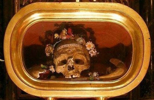 Urna con los fragmento del supuesto esqueleto de Valentín: una calavera, dos fémur y varios huesos, que se encuentran en Iglesia de San Antón de...
