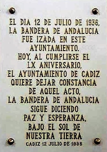 El día 12 de julio de 1936, Blas Infante, pronuncio en un discurso desde el balcón del ayuntamiento de Cádiz ‘y se izó la bandera...