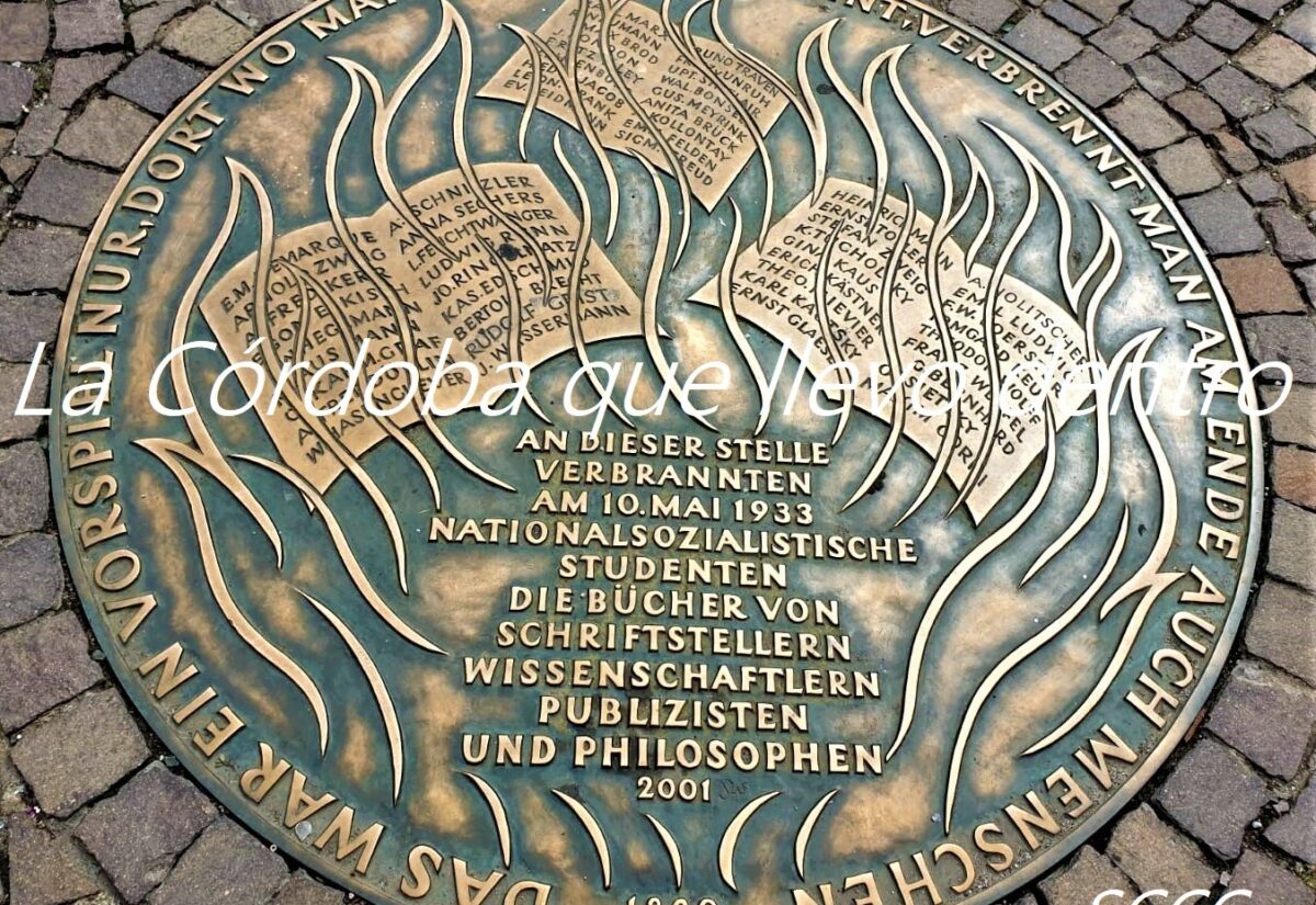 Placa metálica en el suelo de la plaza de Römerberg de Frankfur que conmemora la quema de libros por parte de los estudiantes de la...