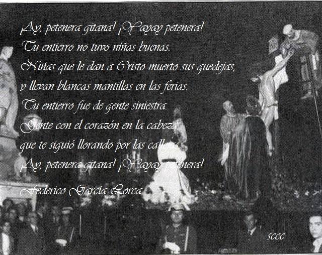 ¡Ay, petenera gitana!¡Yayay petenera!Tu entierro no tuvo niñasbuenas.Niñas que le dan a Cristo muertosus guedejas,y llevan blancas mantillasen las ferias.Tu entierro fue de gentesiniestra.Gente con...