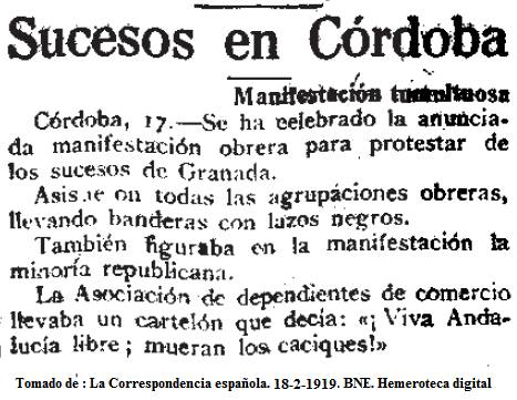 Recorte del periódico «La Correspondencia Española», publicado el 18 de febrero de 1919. Este diario era uno de los más importantes de la época en España y cubría noticias de ámbito nacional e internacional. El artículo hace referencia a la manifestación obrera ocurrida en Córdoba el 17 de febrero de 1919y menciona la pancarta con la frase histórica: «¡Viva Andalucía libre! ¡Mueran los caciques!»