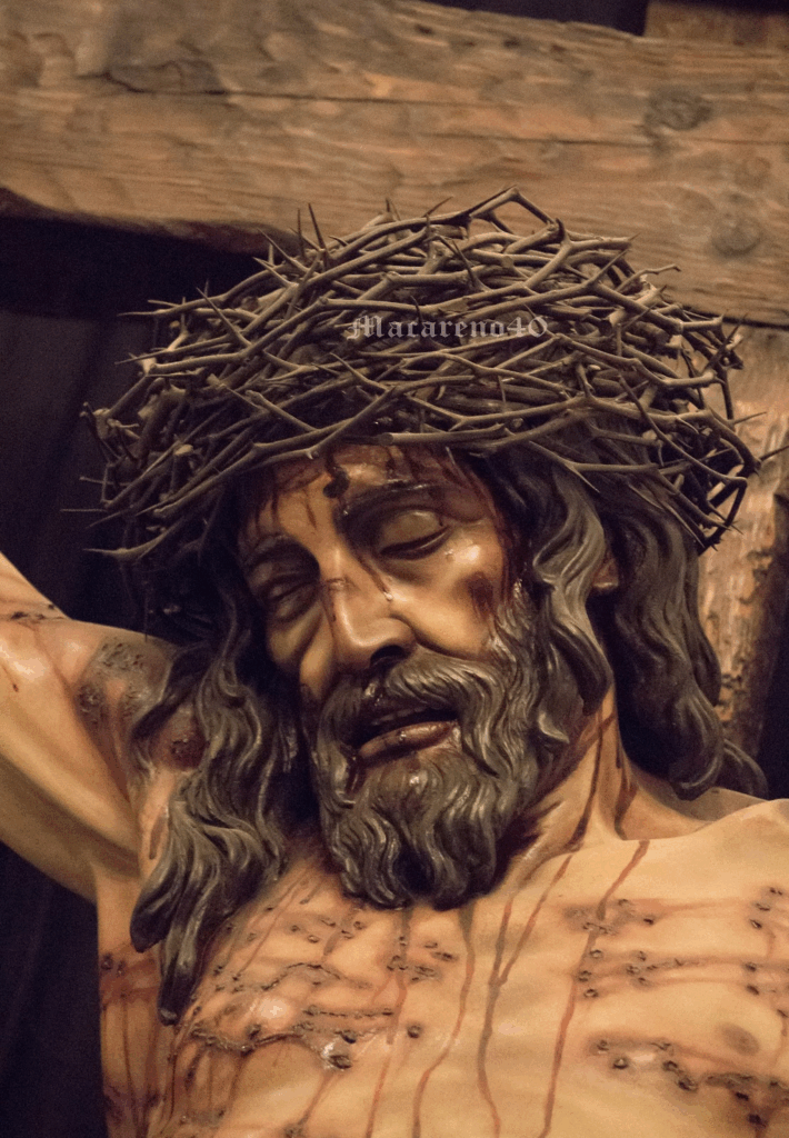 Clavos en las muñecas, no en las palmas, pues se ha demostrado que solo así podría sostenerse el peso del cuerpo sin desgarrarse. Sangre realista, con flujos compatibles con la postura en la cruz y la muerte por shock traumático e hipovolémico. En las rodillas presenta rastros de arena traída de Tierra Santa, simbolizando los golpes sufridos al caer. El rostro, con un ojo amoratado y la boca semiabierta, refleja el sufrimiento y la agonía.