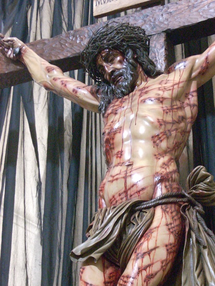 Se trata de un Cristo forense, científico y profundamente devocional. El cuerpo cadavérico del Cristo aparece ya muerto, con signos propios del fallecimiento por crucifixión, como el vientre hinchado por asfixia y colapso torácico. Heridas realistas se reproducen hasta 120 marcas visibles de la flagelación, infligidas con un látigo romano de tres correas con bolas de plomo en sus extremos, conocido como flagrum.