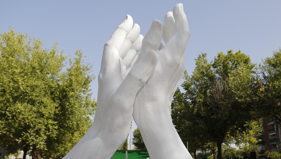 Monumento en Córdoba a los sanitarios del Covid-19. Dos manos aplaudiendo, que recuerda a los sanitarios que han hecho frente al Covid-19. Obra de José Antonio Navarro Arteaga. Donación de los empresarios del mármol de Macael.  Se encuentra frente al hospital provincial de Córdoba y al colegio mayor Séneca.