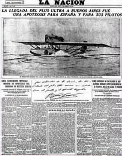 Fotografía de la portada del diario La Nación de Buenos Aires el día siguiente a la llegada del Plus Ultra. sccc.