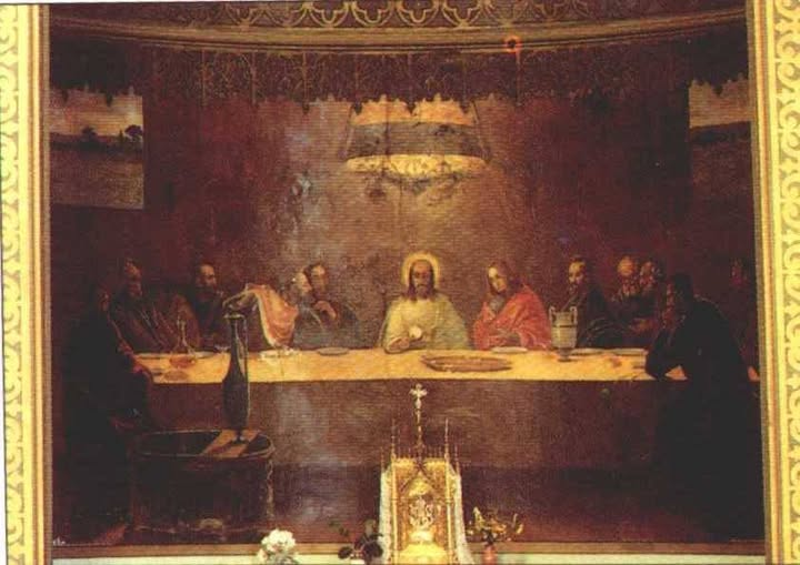 La Santa Cena de la iglesia de Nuestra Señora de la Asunción de Porcuna corresponde a un grupo de tres obras murales que junto con la Asunción y la Sagrada Familia, Julio Romero de Torres realizo en los años 1903 y 1904. Aunque no era aficionado a la pintura religiosa unos amigos lo convencieron para decorarla a recién construido templo, lo que abordo con tres frescos de amplio fórmanos. Estas pinturas de Porcuna evidencian la sólida formación de un joven Romero de Torres, lleno de recursos que le capacitaron la realización de este gran encargo. Igualmente, pueden adivinarse ya en ellas, algunos de los rasgos de la época de madurez del artista, que se convertiría, pocos años más tarde, en uno de los pintores más comprometidos con los movimientos artísticos y los intelectuales más avanzados de su época.
