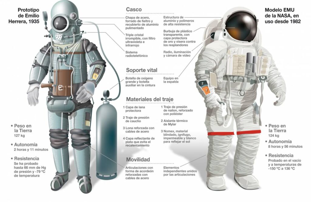 Traje espacial de Emilio Herrera Linares 1935 y el de la NASA 1982