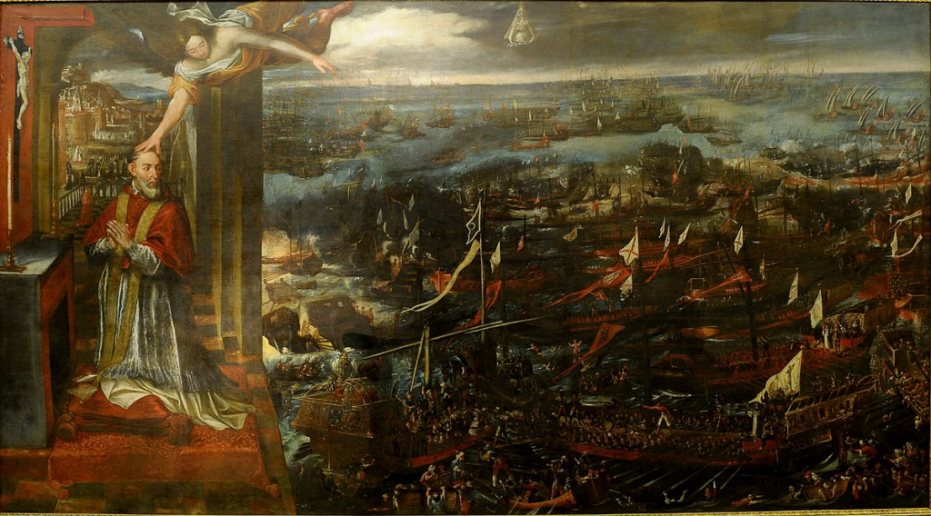 Pio V rezando delante de un crucifijo un ángel le toca la cabeza y le anuncia la victoria, al fondo se ven la batalla de Lepanto. En el cielo aparición de la Virgen. Lienzo realizado en 1650, con motivo de su santificación. Atribuido a Juan de Toledo. Museo Naval de Madrid