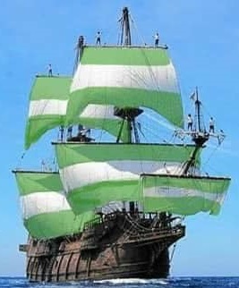 Imagen del Galeón Andalucía con las velas que reflejan el diseño de la bandera de Andalucia.