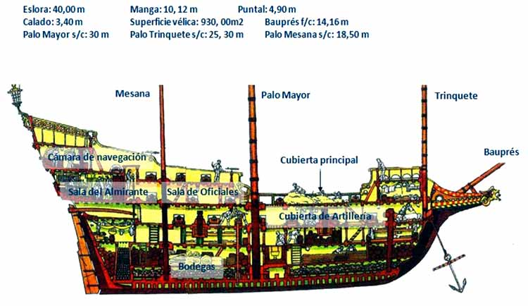 Este navío replica a los barcos que formaban parte de las flotas de la Carrera de Indias, que durante tres siglos transportaron mercancías, personas e ideas entre España, América y Filipinas. Aquellos galeones combinaban la gran capacidad de carga de las naos con la velocidad y maniobrabilidad de las carabelas, respondiendo así a las necesidades comerciales y coloniales del Imperio español.