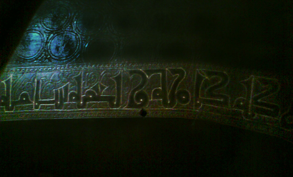 Detalle de la inscripción en cúfico sobre el pecho de la escultura que dice:
