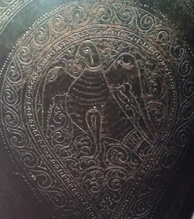 Las alas están labradas con plumas estilizadas, el pecho con escamas semicirculares y la espalda con círculos entrelazados. Cada pata luce un cartucho en forma de lágrima con motivos zoomorfos: leones en las delanteras y aves, probablemente águilas, en las traseras.