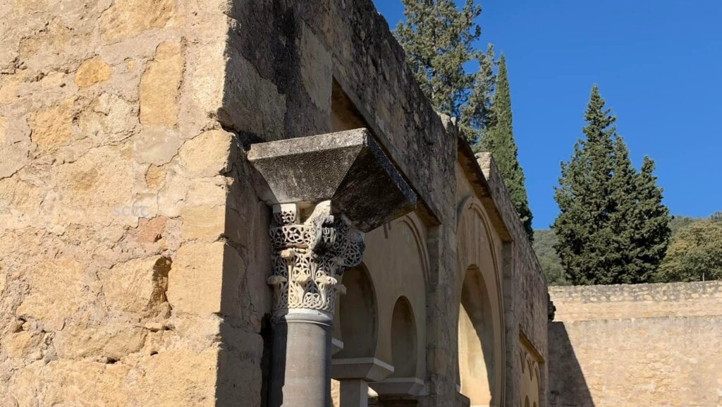 Había hecho alfombrar el camino desde la puerta de Córdoba a la de al-Zahra, a una parasanga (aproximadamente cinco kilómetros y medio de distancia), y colocado hombres a derecha e izquierda del camino con las espadas, largas y anchas, desnudas en la mano, de manera que las del lado izquierdo se juntaban con las del derecho, formando como nervios de bóvedas, y dio orden de que los embajadores anduvieran entre aquellas espadas, bajo su sombra, como si fuera una galería cubierta.