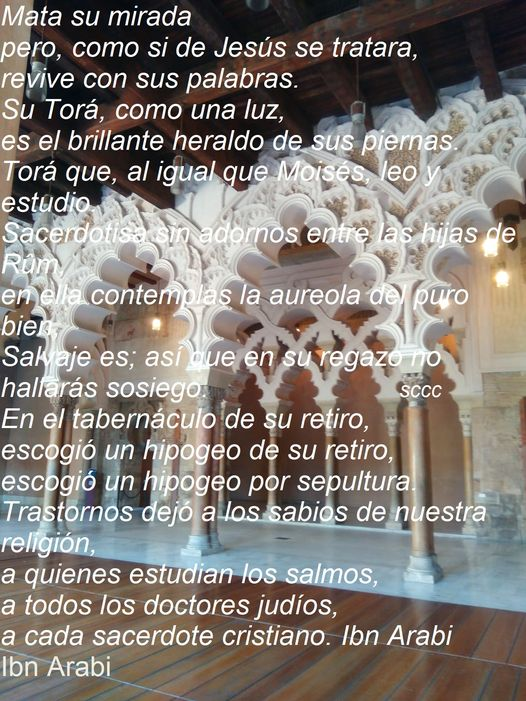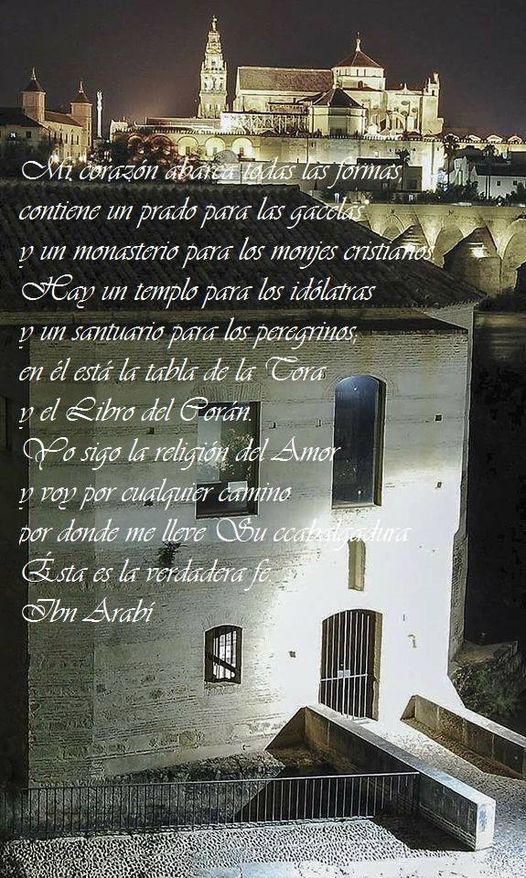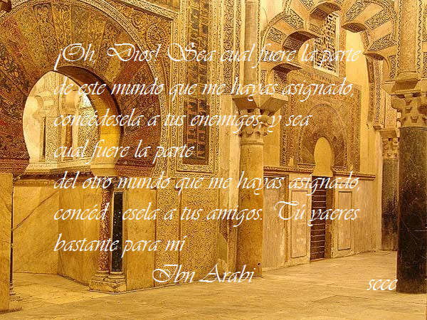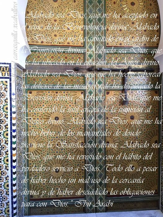 “Alabado sea Dios, que me ha aceptado en el reino de la Benevolencia divina. Alabado sea Dios, que me ha admitido en el jardín de la Compasión divina. Alabado sea Dios, que me ha ubicado en la estación del Amor divino. Alabado sea Dios, que me ha hecho saborear las delicias de las mesas donde ha desplegado la Provisión divina. Alabado sea Dios, que me ha conferido la sutil gracia de la sumisión al Deseo divino. Alabado sea Dios, que me ha hecho beber de los manantiales de donde proviene la Satisfacción divina. Alabado sea Dios, que me ha revestido con el hábito del verdadero servicio a Dios. Todo ello a pesar de haber hecho un mal uso de la cercanía divina y de haber descuidado las obligaciones para con Dios.” Ibn.Arabi.
