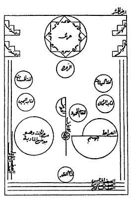 Plano de la Plana de la Asamblea en el Día del Juicio de Ibn Arabi. Este esbozo del Futuhat al-Makkiya de ibn-Arabi fue la inspiración para el diseño de la tumba Arjumand Banu más conocida como. El Taj Mahal,