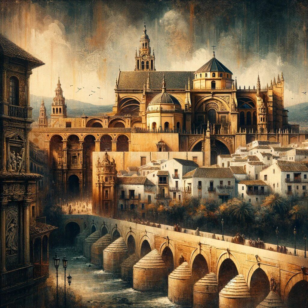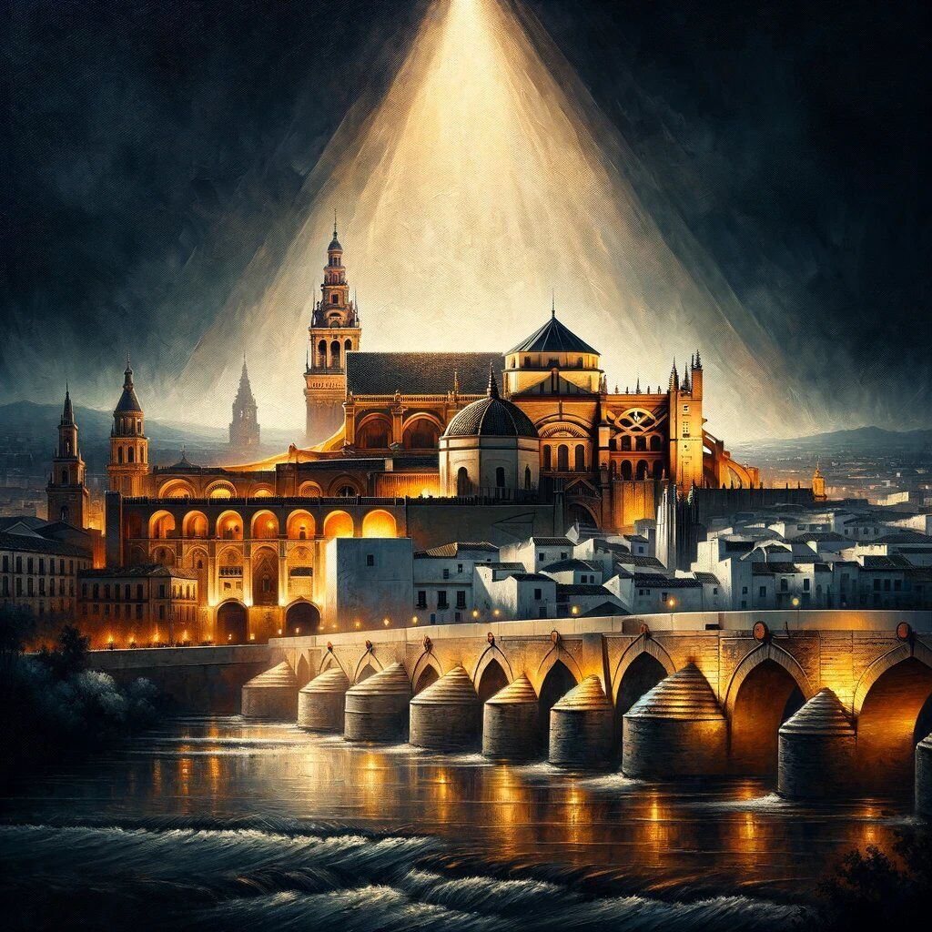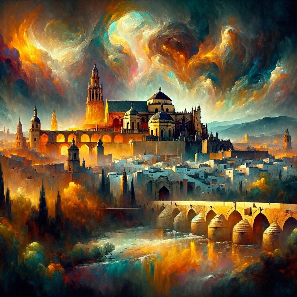No hace mucho tiempo que la inteligencia artificial se encuentra entre nosotros, aunque terminara contándonos el pasado visto con sus propios ojos. Ya en la fase inicial en la que se encuentras, nos trae ecos de unas amalgamas de edificaciones, en el caso que nos ocupa, donde las construcciones de Córdoba parecen sacadas de una película de aventuras fantásticas. Gracias más que nunca a la Mezquita de Córdoba que a través de la insuperable silueta de la Gran Aljama se puede identificar Córdoba. Sccc.