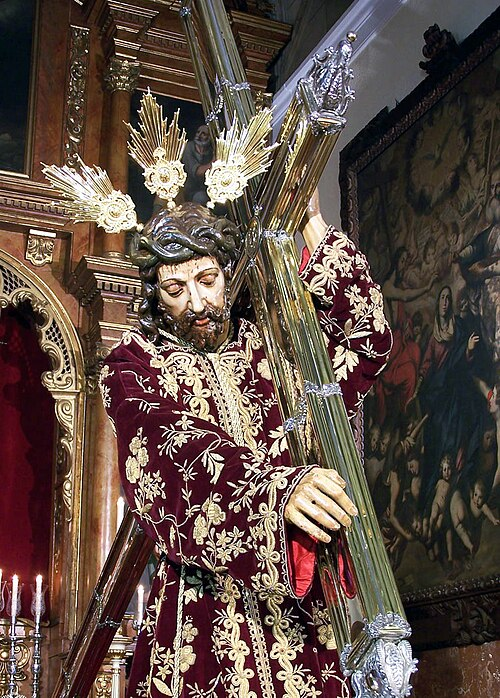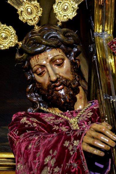 Uno de los elementos más singulares de esta imagen es su Cruz, que se apoya sobre el hombro izquierdo de Cristo, en una posición inusual que rompe con la iconografía tradicional, en la que suele apoyarse sobre el derecho. Esta cruz no es de madera sencilla, sino una verdadera obra de arte en sí misma: fue realizada en el año 1860 por el platero Francisco Parias Álvarez, destacado orfebre cordobés. La pieza destaca por su estructura de cristal engarzado en plata dorada, con cantos moldurados, lo que le otorga una estética única y preciosista. Este elemento, de gran valor artístico y simbólico, refuerza la dignidad de Cristo en su camino al Calvario y al mismo tiempo aporta una nota de luminosidad y espiritualidad a la imagen.