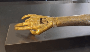 .Fotografía de la reliquia del brazo derecho de San Juan el Bautista, que utilizó para bautizar a Jesús que se encuentra en el palacio de Topkapi en Estambul. La capilla de la catedral dedicada a San Juan Bautista en Siena (Italia) también afirma poseer el brazo derecho del Santo.