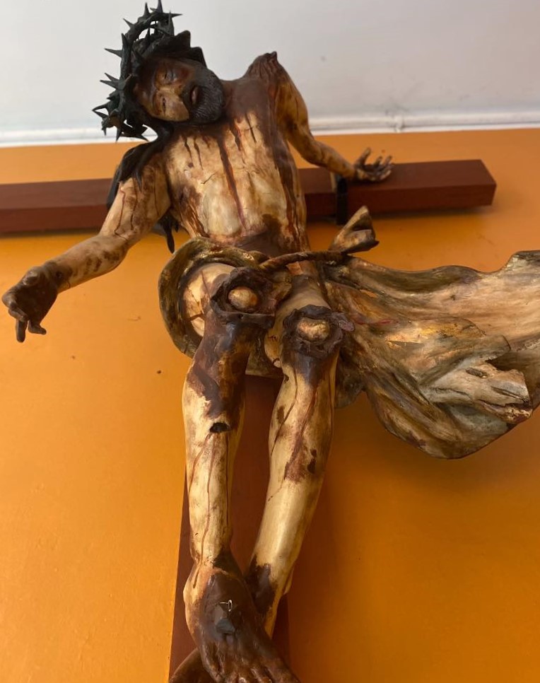 Fotografía del las paginas sudamericanas que muestran la Cruz del Perdón con un Jesús crucificado con el brazo derecho desclavado de la Cruz y extendido hacia abajo y el cuerpo colgado del izquierdo en una actitud un poco singular dentro de iconografía católica convencional.