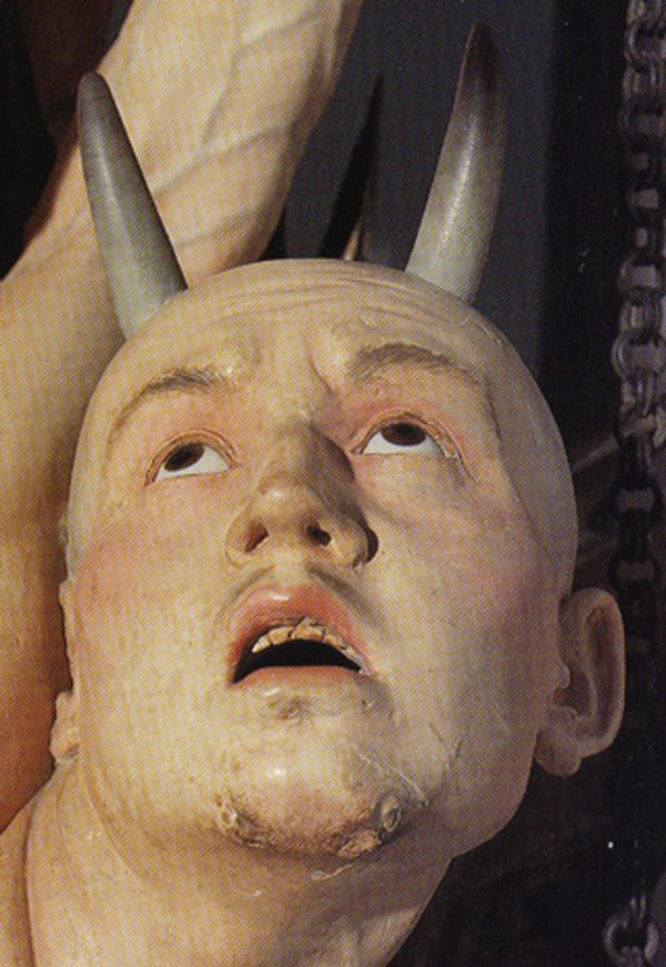Detalle del San Miguel de la Roldana. En el ángel caído se puede ver el rostro del marido de Luisa, un borracho ligero de manos con su mujer, la que la artista mantuvo siempre, pero que con esta escultura supo ponerlo en el sitio que le correspondía.