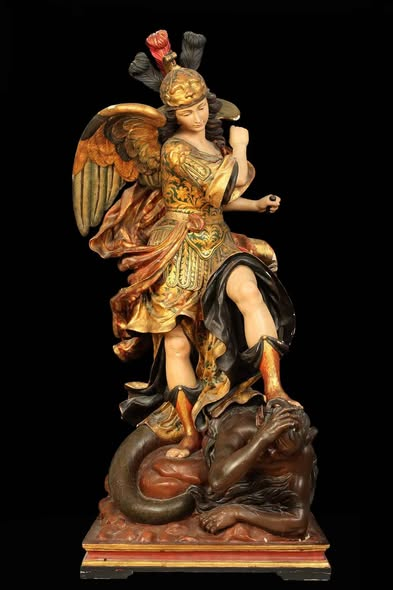 Arcángel San Miguel aplastando al Diablo, de la Roldana que se encuentra en la iglesia del Monasterio del Escorial. Fue un encargo de la reina Mariana mujer de Carlos II