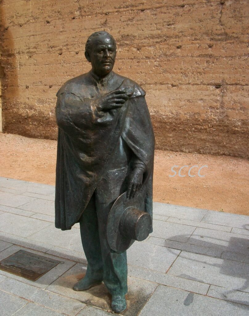 Escultura de Luis Navas sobre el suelo del Alcázar Viejo donde puede observarse su capa y el sombre cordobés que sostiene con su mano derecha y donde la placa cercana, también posada sobre la solería nos recuerda su creatividad y amor por la ciudad, sin olvidar las murallas milenarias que lo arropan.