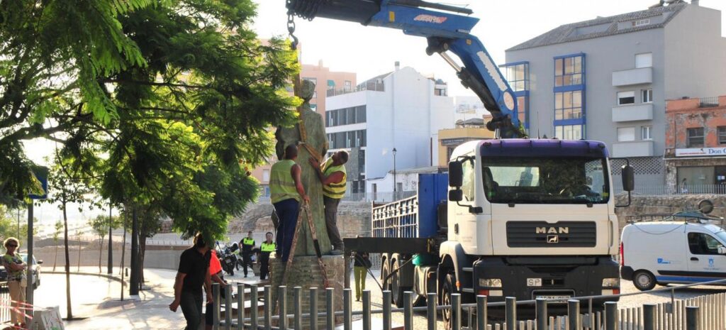 Retirando la escultura del Almanzor por el Ayuntamiento en la Avenida Blas Infante en el Parque arqueológico de las murallas merinies de Algeciras.