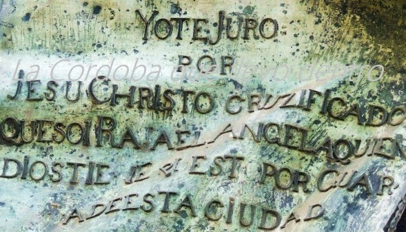 Cartela en metal con el juramento del Custodio que se encuentra en el monumento del Triunfo a San Rafael en la puerta del puente Romano de Córdoba